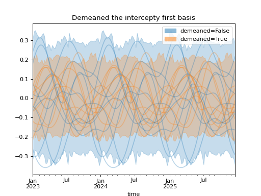 import numpy as np import pandas as pd import xarray as xr import matplotlib.pyplot as plt from pymc_marketing.mmm import HSGPPeriodic from pymc_marketing.plot import plot_curve seed = sum(map(ord, "Periodic GP")) rng = np.random.default_rng(seed) scale = 0.25 ls = 1 kwargs = dict(ls=ls, scale=scale, period=52, cov_func="periodic", dims="time", m=20) n = 52 * 3 dates = pd.date_range("2023-01-01", periods=n, freq="W-MON") X = np.arange(n) coords = {"time": dates} hsgp = HSGPPeriodic(demeaned_basis=False, **kwargs).register_data(X) hsgp_demeaned = HSGPPeriodic(demeaned_basis=True, **kwargs).register_data(X) def sample_curve(hsgp): return hsgp.sample_prior(coords=coords, random_seed=rng)["f"] non_demeaned = sample_curve(hsgp).rename("False") demeaned = sample_curve(hsgp_demeaned).rename("True") combined = xr.merge([non_demeaned, demeaned]).to_array("demeaned") _, axes = combined.pipe(plot_curve, "time", same_axes=True) axes[0].set(title="Demeaned the intercepty first basis") plt.show()